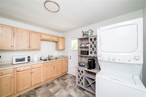 Fully equipped kitchen with everything you need, including a stove/oven, refrigerator, microwave, air fryer, blender, cookware, and a coffee bar stocked with coffee, creamer, and sugar. Stackable washer and dryer included.