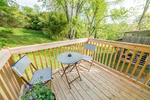The private backyard offers a cozy back porch with a bistro table, fire pit, solar lights, and four Adirondack chairs—perfect for relaxing evenings.